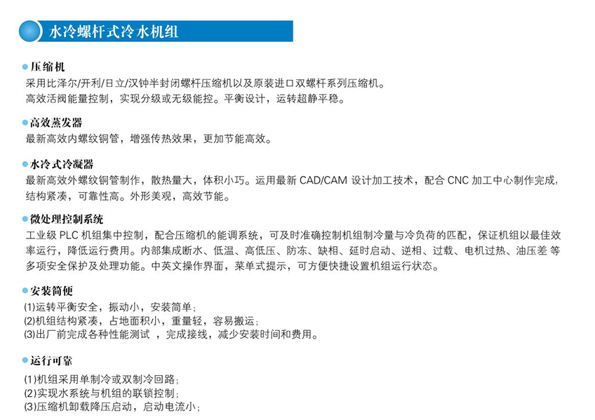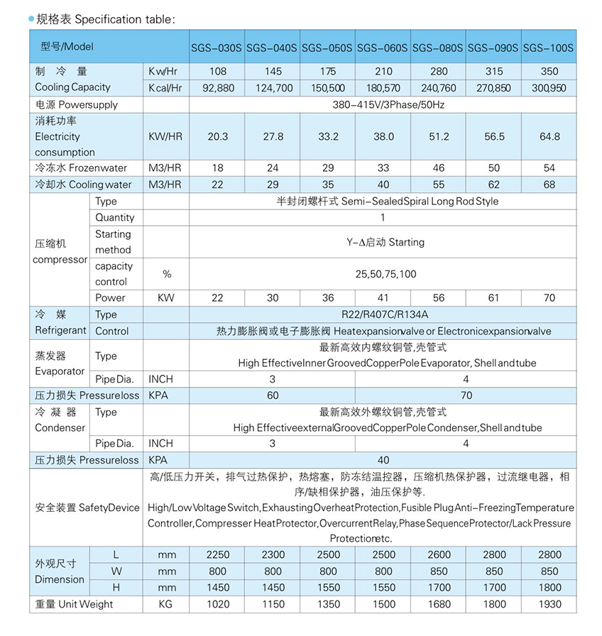 1、以上規(guī)格參數(shù)能力的測定工況:冷凍水入口溫度12℃,出口溫度6℃,冷卻水入口溫度30℃,出口溫度35℃;
